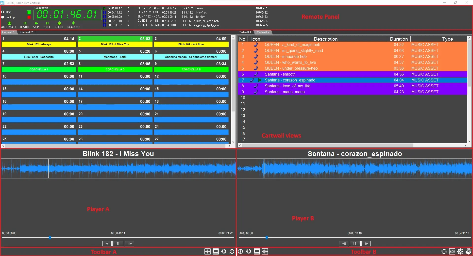 Cartwalls: Below the remote panel are displayed the cartwalls configured. This space is split in 2: the left side shows one cart wall as a grid, like the one integrated into Radio Live Playout; another cart wall is displayed on the right side as a list.