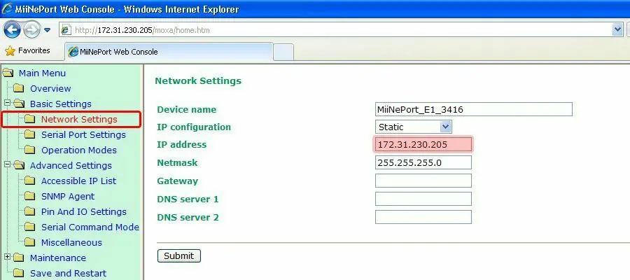 5. Navigate to the 'Network Settings', it is possible to optionally change the network device name as well as its IP address (e.g. 172.31.230.205). Once done press [Submit].