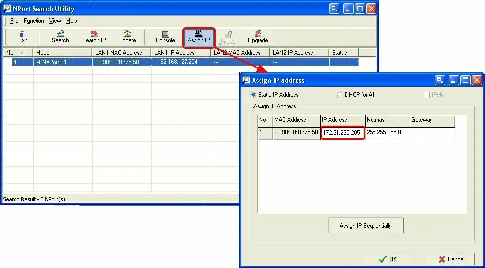 3. Press the [Assign IP] button to change the default IP address2 of the module into another address: