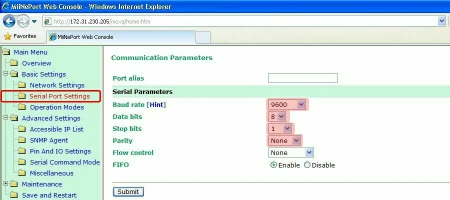 6. Navigate to the 'Serial Port Settings' section and set the following fields and press [Submit]: