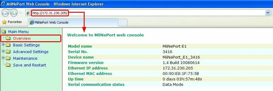 Configure the device 4. In order to start configuring the device, double-click on it, the web browser would be activated with the MiiNePort Web Console: