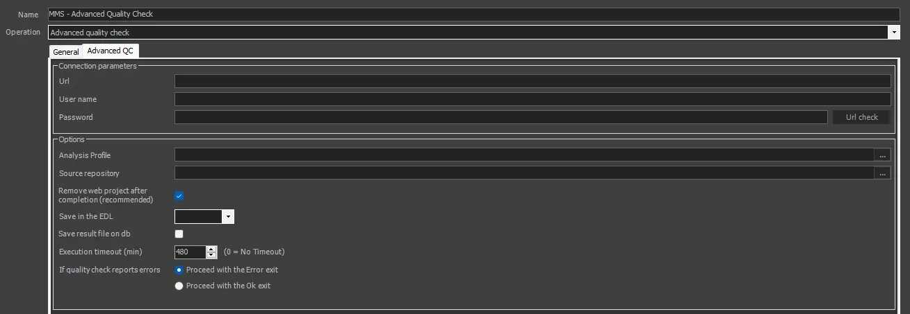 If the quality check reports errors: Select if, in case of error, the action should exit on "error" output or go through "OK" output. This option lets you choose how the workflow will behave if the Advanced QC reports any error during its execution.