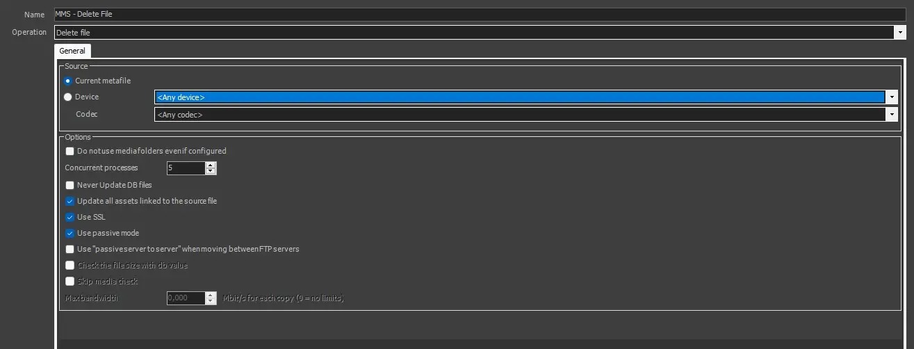 MMS - DELETE FILE is the action used by ETERE system to delete the file in the device specified. Only files in the source device can be deleted.