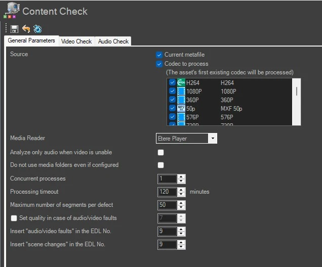 The Media Manager service action Content Check x64 allows to check a file linked to an asset and write EDL segments corresponding to video faults, audio issues and scene changes.