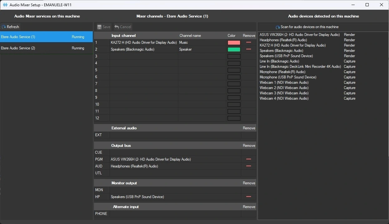 The left column lists the Audio Mixer services installed on the machine, select one to configure it. Etere audio mixer setup recognizes the services installed in the same machine by their number.