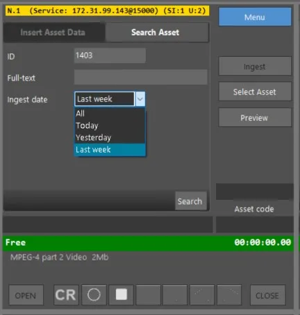 The Insert Asset Data function allows users to create and define new media assets by assigning essential metadata such as type, codec, and storage destination. The Search Asset function provides powerful retrieval capabilities, enabling users to locate assets through ID, keyword-based search, or ingest date filtering within the Etere database.