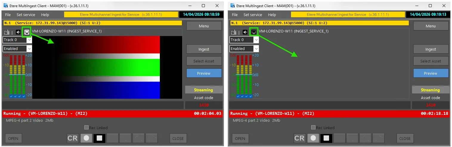 After configuring the input source, the ingest channel can be opened and monitored through the Preview interface.
